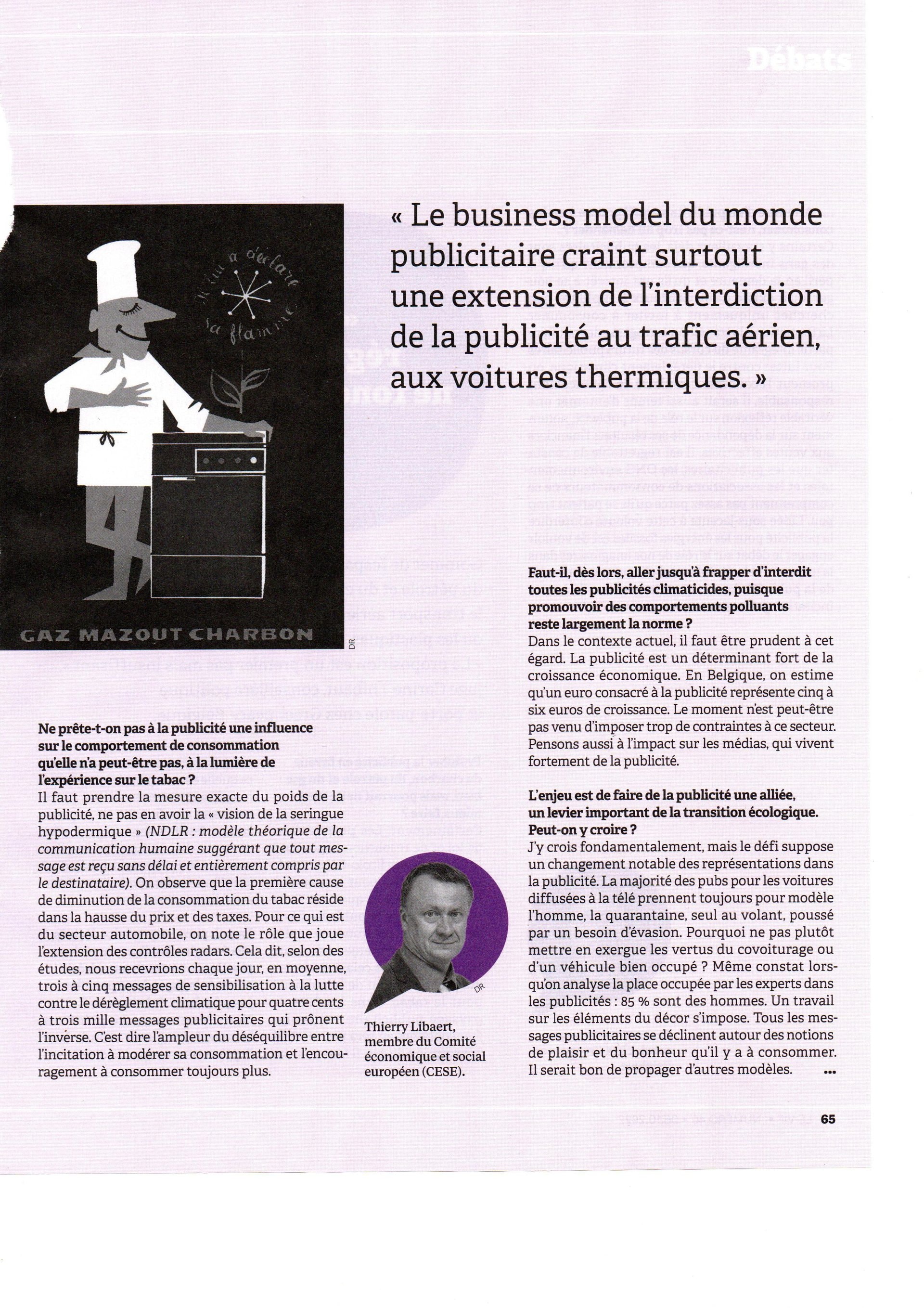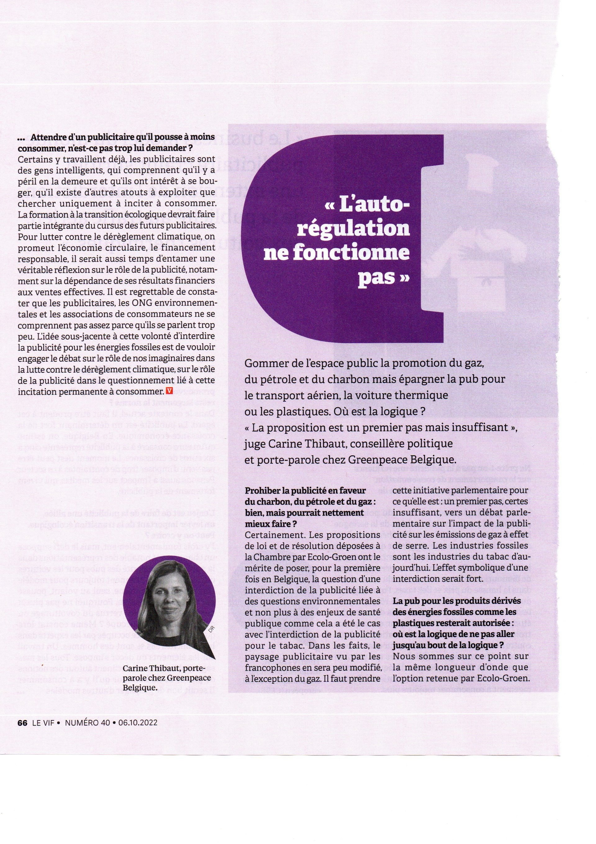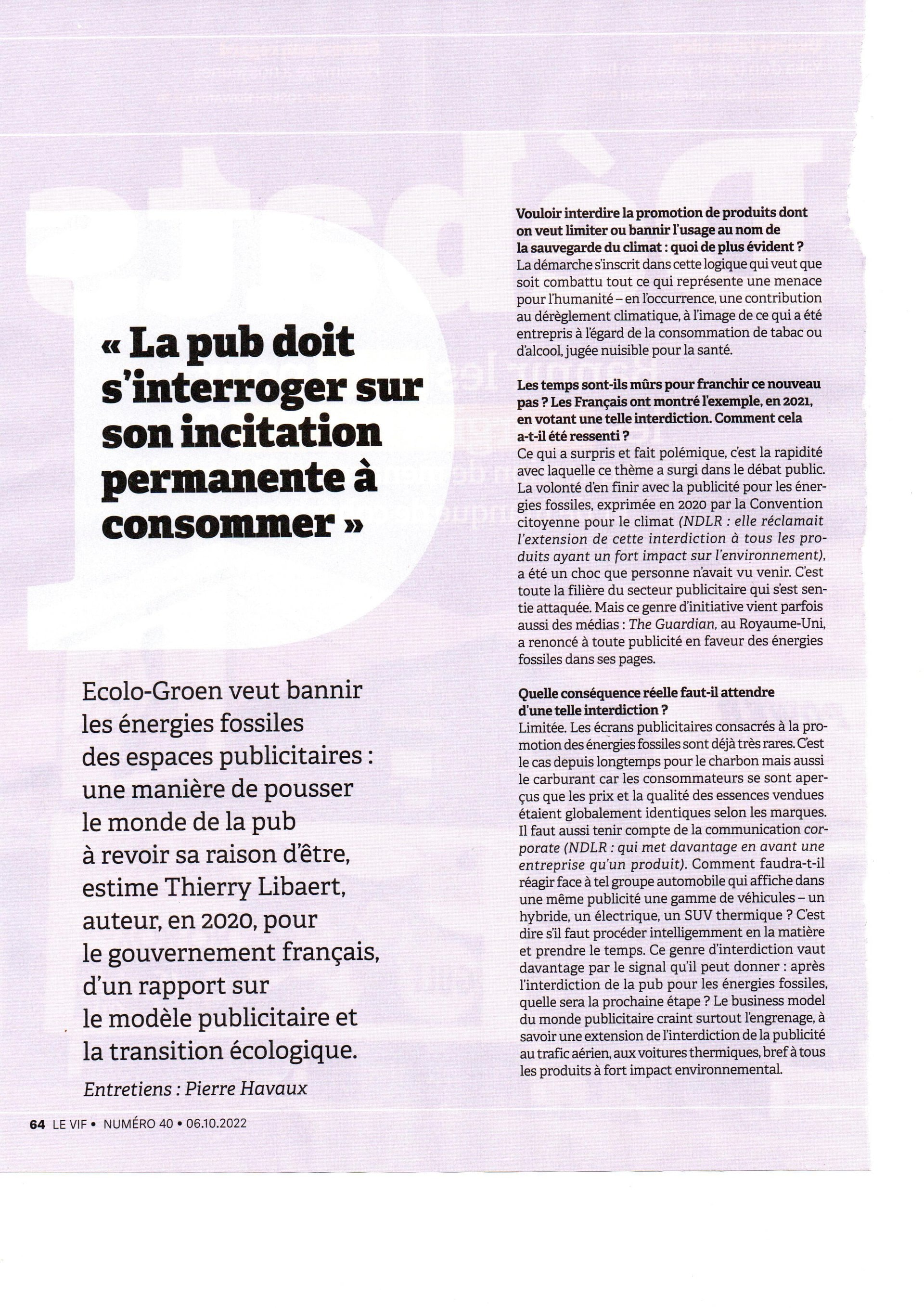 Interview de 3 pages dans la magazine belge Le Vif-Express du 6 au 12 octobre 2022, N°40, page 64 à 66 sur le sujet de la publicité en lien avec la transition écologique. La question centrale est celle de l’interdiction de la publicité sur les énergies fossiles. Le débat qui a eu lieu en France au moment de la Convention citoyenne sur le Climat commence à s’élargir en Europe.